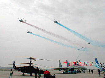 第三屆中國國際航空航天博覽會開幕之二 2000年11月7日 08:43 ![]() 為期七天的第三屆中國國際航空航天博覽會六日在珠海隆重開幕。來自歐、美、亞、非二十七個國家和地區(qū)的八十九架各式軍用、客用、貨運飛機向現(xiàn)場觀眾做精彩飛行表演和靜態(tài)展示。圖為中國某部陸軍航空兵的直升機進行編隊飛行。中新社圖 蕭琨 攝