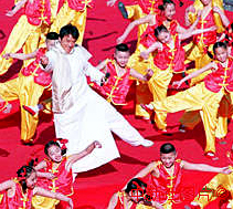 香港著名歌星成龍,十九日在北京參加“中華龍騰”海內(nèi)外青年匯長(zhǎng)城活動(dòng),在八達(dá)嶺古老的長(zhǎng)城烽火臺(tái)上放聲高歌。作者:宗金柱