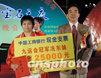 圖:廣東肇慶重獎九運會柔道冠軍冼東妹 2001年12月09日 18:58 ![]() 廣東肇慶四會籍選手冼東妹(左)在九運會上奪得五十二公斤級柔道冠軍,肇慶四會市特別獎勵她25000元人民幣。圖為市委書記龍紅輝八日親手把現(xiàn)金支票送到冼東妹手中。中新社圖 黃耀輝 攝 |