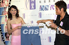 ![]() 影視紅星洪欣14日在香港出席「減肥堂」殲脂代言人記者會(huì)。大會(huì)特別安排別開(kāi)生面的「身寬舊褲大比拼」,將代言人洪欣殲脂前的長(zhǎng)褲尺碼展示。中新社圖 鄧慶樂(lè) 攝