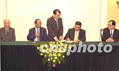 澳門特區(qū)政府與銀河公司簽署博彩經(jīng)營批給合同 2002年06月27日 09:10 ![]() 澳門特區(qū)行政長官何厚鏵二十六日輿銀河簽署協(xié)議后,和美國拉斯維加斯金沙公司董事長、銀河主要股東肖登·艾德森夫婦親切交談。中新社記者 李剛 攝