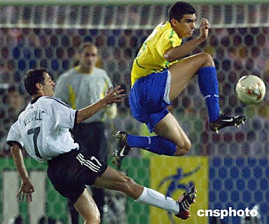 圖:世界杯德巴決戰(zhàn) 盧西奧騰空躍起阻擋對手 2002年06月30日 19:49 ![]() 6月30日2002韓日世界杯決賽巴西與德國隊的決賽在日本橫濱國際競技體育場進行,上半場比分為0:0。圖為巴西隊盧西奧騰空躍起阻擋德國前鋒諾伊維爾。