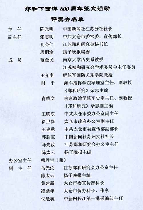 “鄭和下西洋600周年”征文啟示 2002年07月05日 10:36 ![]() 鄭和下西洋600周年征文活動(dòng)評(píng)委會(huì)名單 為紀(jì)念鄭和下西洋600周年,弘揚(yáng)鄭和開(kāi)放和探險(xiǎn)精神,進(jìn)一步提升鄭和七下西洋起錨地太倉(cāng)的知名度,促進(jìn)太倉(cāng)的兩個(gè)文明建設(shè)和經(jīng)濟(jì)發(fā)展,特舉行征文活動(dòng)。 一、征文時(shí)間 從2002年7月11日起(鄭和下西洋紀(jì)念日)至2003年7月11日止。 二、征文內(nèi)容 圍繞鄭和七下西洋起錨地太倉(cāng)與鄭和,從歷史與現(xiàn)實(shí)的結(jié)合上,從跨越600年的時(shí)間和空間中,從不同視角充分展示鄭和精神及給太倉(cāng)歷史、經(jīng)濟(jì)、文化等方面帶來(lái)的影響。 三、征文形式 1、學(xué)術(shù)論文類; 2、文學(xué)類,包括小說(shuō)、散文、隨筆、詩(shī)歌、故事、盈聯(lián)等; 3、新聞?lì),包括消息、通訊、特?xiě)、專訪、述評(píng)等。 四、征文字?jǐn)?shù) 論文一般不超過(guò)5000字;文學(xué)作品一般不超過(guò)3000字(長(zhǎng)、中篇小說(shuō)例外);新聞一般不超過(guò)1500字。 五、征文刊用 征文作品在中新江蘇網(wǎng)、中新網(wǎng)長(zhǎng)江第一港、揚(yáng)子晚報(bào)“聚焦蘇錫!睂0、《鄭和研究》雜志刊用。 六、征文評(píng)比 征文頒獎(jiǎng)活動(dòng)在2003年9月份舉行,評(píng)出論文類、文學(xué)類、新聞?lì)愐坏泉?jiǎng)各一名,獎(jiǎng)金3000元;二等獎(jiǎng)各三名,獎(jiǎng)金1500元;三等獎(jiǎng)各五名,獎(jiǎng)金500元,另評(píng)出榮譽(yù)獎(jiǎng)若干名。 七、征文請(qǐng)寄江蘇省太倉(cāng)市體育東路58號(hào),中新網(wǎng)長(zhǎng)江第一港編輯部,郵編215400。另電子文檔以word形式保存,寄jiangzhenjiang@chinanews.com.cn作者請(qǐng)自留底稿,所有應(yīng)征作品一律不退稿。 八、本次征文活動(dòng)解釋權(quán)在征文活動(dòng)組委會(huì)。 主辦單位:太倉(cāng)市委、市人民政府 中國(guó)新聞社江蘇分社 揚(yáng)子晚報(bào)“聚焦蘇錫!本庉嫴 江蘇鄭和研究會(huì) 二OO二年七月一日