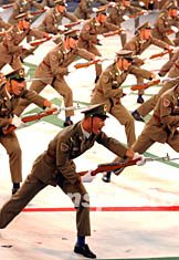 圖:駐港部隊“刺殺團體操”為軍樂團表演添彩 2002年07月06日 20:06 ![]() 七月六日晚,解放軍駐港部隊參加中國人民解放軍軍樂團在香港的演出,他們表演的“刺殺團體操”威風(fēng)凜凜,為軍樂團演出錦上添花。潘索菲 攝