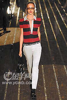 在Gucci今季以揚(yáng)帆出海為主題的日間裝扮中,可以見到一條簡潔清爽的白色鉛筆褲貫穿始終,上身的海軍藍(lán)、白色及紅色條紋T恤,則用性感的低V設(shè)計來吸引人,腰帶細(xì)得若有若無,腳上是耀眼的金色高跟鱷魚皮鞋,既給人較中性化的感覺,又不失女性的韻味。要帥又要不失性感,實際上,這就是新帥男孩的最佳尺度。