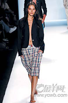 而更加隨意的Tommy Hilfiger,則將浪漫的海灘風(fēng)情演繹得更隨性,以寬大有型的格仔短褲搭配隨意敞開的休閑襯衫,簡單明了,一頭長發(fā)和敞開的領(lǐng)口是最具風(fēng)情的女性化標(biāo)簽。