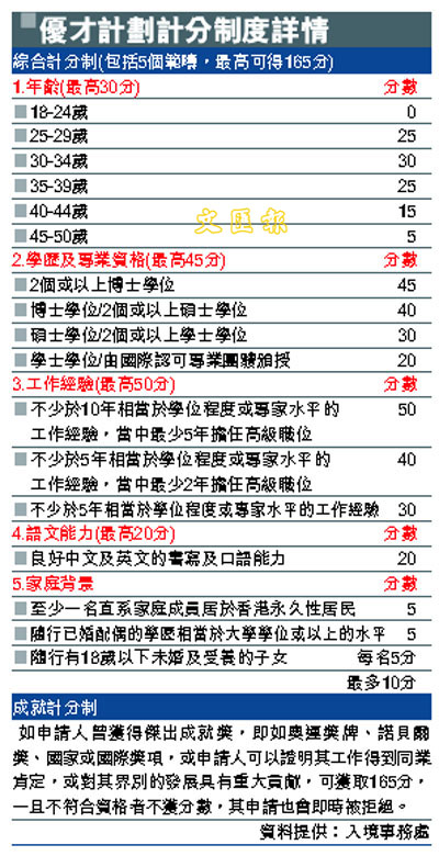 香港入境處在六月二十八日公布優(yōu)才計劃的計分方法并即日接受申請。符合“基本資格”所有條件的申請人,可選擇以“綜合計分制”或“成就計分制”接受進一步評核。每名申請人只能在同一時間提交一份申請,并只能在同一次申請中選擇以一種計分制進行評核。