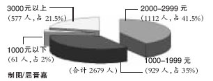截至昨日,網(wǎng)上調(diào)查問及作為一名大學(xué)生,希望工作單位給予怎樣的報(bào)酬時(shí)?參加投票的2679人中,選擇2000元—2999元的最多,為1112人;929人選擇1000元—1999元,選擇1000元以下的為61人,有577人期望3000元以上月薪,即近八成(78%)畢業(yè)生期望月薪在3000元以下。