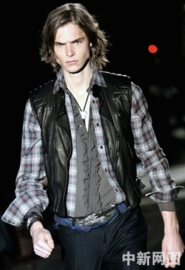 1月17日,在意大利米蘭舉行的2006/07秋冬男裝發(fā)布會上,一名模特在展示Gucci服裝。