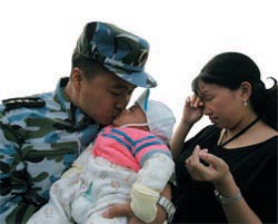 碼頭上滿是歡送的人群,其中最引人注目的是官兵的妻子們。這是一群偉大的女性,大家都親切地叫她們“礁嫂”。她們既有自己的工作,又要在分居的日子里獨自操持家務,孝敬老人,撫育孩子,還要為守衛(wèi)孤礁的丈夫擔驚受怕。昨天下午,我們同幾名“礁嫂”座談,說起自己的丈夫和家庭,她們一會兒哭,一會兒笑,一會兒令人心酸,一會兒讓人開懷,以致所有記者都對她們肅然起敬。今天,這些“礁嫂”一遍又一遍地撫摸整理著丈夫胸前的大紅花,情不自禁地淚流滿面。