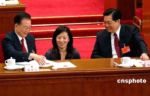 三月十五日上午,十一屆全國人大一次會議第五次全體會議在北京人民大會堂舉行。圖為會議進行投票間隙,胡錦濤(右)、溫家寶(左)與奧運冠軍楊揚在主席臺上交談。中新社發(fā) 王東明 攝