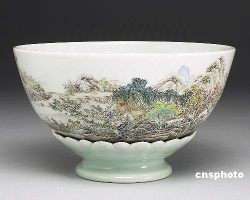 圖為展出的“磁胎洋彩山水詩(shī)意轉(zhuǎn)旋大碗”。