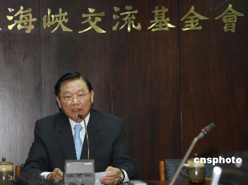 10月21日中午,臺(tái)灣;鶗(huì)董事長(zhǎng)江丙坤召開臨時(shí)記者會(huì),譴責(zé)暴力襲擊來臺(tái)灣進(jìn)行學(xué)術(shù)訪問的海協(xié)會(huì)副會(huì)長(zhǎng)、廈門大學(xué)傳播學(xué)院院長(zhǎng)張銘清。中新社發(fā) 耿軍 攝