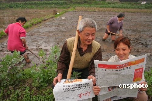 3月5日,重慶榮昌縣杜家壩村農(nóng)民在春耕的休息間隙,一起閱讀登載有兩會消息的人民日報。連日來人民日報上“兩會特刊”中有關農(nóng)民生產(chǎn)、糧食生產(chǎn)與新農(nóng)村建設等方面的相關信息,引起當?shù)卮焊r(nóng)民的密切關注。中新社發(fā) 朱蕓鋒 攝