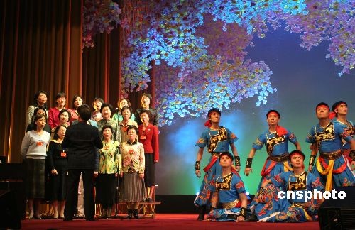 圖為上海全體女代表(左)與藝術界聯(lián)袂演唱《天堂》。