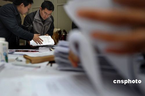 全國政協(xié)十一屆一次會議委員提案接收工作于三月九日下午兩點截止,圖為大會提案組辦公室工作人員在清點提案。中新社發(fā) 廖攀 攝