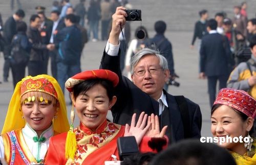 3月10日上午,十一屆全國人大一次會(huì)議在北京人民大會(huì)堂舉行第三次全體會(huì)議。香港鳳凰衛(wèi)視著名主持人曹景行,在大會(huì)堂外抄后路偷襲抓拍靚麗的少數(shù)民族代表。中新社發(fā) 廖攀 攝