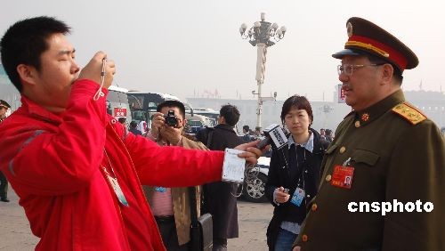 3月10日,十一屆全國人大一次會議在北京人民大會堂舉行第三次全體會議。一名記者在會場外的天安門廣場抓住一名解放軍中將采訪,因為機會難得,一手拿話筒、一手握相機著實忙活。中新社發(fā) 劉萬強 攝