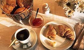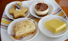 正統(tǒng)的英式下午茶的點心是用三層點心瓷盤裝盛,第一層放三明治、第二層放傳統(tǒng)英式點心Scone、第三層則放蛋糕及水果塔;由下往上開回吃。至于Scone的吃法是先涂果醬、再涂奶油,吃完一口、再涂下一口!