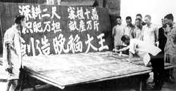 雞公山水稻畝產(chǎn)四萬八真相 2000年7月7日 14:09 ![]() 安徽省樅陽縣一塊號稱畝產(chǎn)1·6萬斤的 “衛(wèi)星田”。田里的稻子是從各地移來的 ![]() 大躍進(jìn)中,農(nóng)民表決心。照片據(jù)《圖片中國百年史》 □張勝林(河南信陽) 1958年9月1日,信陽縣雞公山人民公社新集大隊放出河南省水稻畝產(chǎn)特大“衛(wèi)星”:6畝6分3厘干部水稻試驗田總產(chǎn)324375·5斤,平均畝產(chǎn)48925·7斤。這顆大“衛(wèi)星”升天后,新華社隨即發(fā)了消息,轟動全國。全省各級領(lǐng)導(dǎo)親臨參觀和總結(jié)經(jīng)驗,9月9日《河南日報》第二版以“雞公山上紅旗插,水稻畝產(chǎn)四萬八”的醒目標(biāo)題,對大“衛(wèi)星”的組織施放作了詳細(xì)報道。 這個被大躍進(jìn)狂風(fēng)吹起來的水稻“衛(wèi)星”,雖在當(dāng)時被歌頌為信陽人民農(nóng)業(yè)大躍進(jìn)的偉大創(chuàng)舉,卻留下了一個謎:照“衛(wèi)星”田里的水稻總產(chǎn)量計算,那么,這塊“衛(wèi)星”田平均每平方米就得產(chǎn)出稻谷73斤。然而,73斤稻谷就是放在一平方米的空地里,也要堆出一定高度,何況稻谷結(jié)在稻穗上,直徑3毫米左右的稻莖又如何承受得了呢? 為了解開這個謎,我們對當(dāng)年目睹現(xiàn)場的一些同志進(jìn)行了反復(fù)調(diào)查訪問。在調(diào)訪過程中,這些同志不僅幫助我們弄清了雞公山水稻畝產(chǎn)“四萬八”的真相,而且訴說了雞公山人民當(dāng)年吞下這個苦果的難言之苦。信陽縣越改越大的躍進(jìn)規(guī)劃 1957年,信陽縣和全國一樣,勝利實現(xiàn)和超額完成了國民經(jīng)濟第一個5年計劃,各條戰(zhàn)線出現(xiàn)了蓬勃發(fā)展的局面。然而,由于從上到下對成績的宣傳夸張,使一些干部的頭腦發(fā)熱,在指導(dǎo)方針上出現(xiàn)了急于求成的“左”的冒進(jìn)。1958年2月26日,中共信陽縣委召開擴大會議,制定并通過了《信陽縣全面躍進(jìn)20條規(guī)劃》,號召和動員全縣人民投入到大躍進(jìn)的洪流之中。 1958年5月,黨的八大二次會議通過總路線:“鼓足干勁,力爭上游,多快好省地建設(shè)社會主義”,在信陽縣宣傳貫徹后,信陽掀起了大躍進(jìn)的高潮。同月底,中共信陽縣委、縣人委對《信陽縣全面躍進(jìn)20條規(guī)劃》進(jìn)行了補充修改,把1958年全縣糧食總產(chǎn)量從原規(guī)劃的8·5億斤提高到“保證實現(xiàn)14億斤,爭取18億斤”(這樣驚人的數(shù)字,信陽縣不僅當(dāng)年沒有實現(xiàn),就是時隔30多年后農(nóng)業(yè)年景比較好的1996年,全縣糧食總產(chǎn)量也才達(dá)到9·5億斤,為1958年規(guī)劃14億斤的67·8%)。同時,中共信陽縣委還提出“十年規(guī)劃,一年實現(xiàn)”的躍進(jìn)口號。外地衛(wèi)星的刺激 1958年6月,廣東省早稻畝產(chǎn)82525斤和河南省西平縣小麥畝產(chǎn)7320斤,這兩顆“衛(wèi)星”消息傳到信陽縣后,信陽縣感到鼓舞和震動。7月5日,中共信陽縣委召開擴大會議,縣委提出:“必須認(rèn)識到今年是農(nóng)業(yè)生產(chǎn)大躍進(jìn)的一年,不是要求增產(chǎn)幾成的問題,而是要翻幾番。因此,必須鼓足干勁,爭取更大勝利”。為了放出信陽縣的農(nóng)業(yè)高產(chǎn)“衛(wèi)星”,縣委要求“樹立敢想、敢說、敢作、敢為的前進(jìn)思想,從而解放思想,破除迷信”。 7月,全國宣傳貫徹毛澤東主席關(guān)于把工、農(nóng)、商、學(xué)、兵組成為一個大公社的指示,信陽縣聞風(fēng)而動,在全信陽地區(qū)率先建立人民公社。7月22日,中共信陽縣委在雞公山召開擴大會議,決定撤銷全縣32個鄉(xiāng)、鎮(zhèn)及一個辦事處,成立12個人民公社?h委要求,各公社要借人民公社化的東風(fēng),更好組織農(nóng)業(yè)生產(chǎn)大躍進(jìn),并示意試辦農(nóng)業(yè)“衛(wèi)星”田塊。 縣委擴大會議結(jié)束后,各公社開始籌劃具有本地特色的農(nóng)業(yè)“衛(wèi)星”,棉花、玉米、紅薯等都被列入“衛(wèi)星”計劃之列。雞公山準(zhǔn)備水稻“衛(wèi)星” 在籌劃“衛(wèi)星”時,地處豫鄂交界的雞公山人民公社黨委提出,淮河北的西平縣能放出小麥畝產(chǎn)七千三的全國大“衛(wèi)星”,我們淮河南的雞公山為何不能利用我們盛產(chǎn)水稻的優(yōu)勢,放出水稻高產(chǎn)“衛(wèi)星”?只要有雄心,思想再解放,“衛(wèi)星”定能升天。為了選準(zhǔn)“衛(wèi)星”的試點,公社黨委曾幾次召開會議研究,最終選擇新集大隊的一塊6畝6分3厘干部試驗田作為“衛(wèi)星”點。 這塊試驗田在5月5日秧苗移栽時,采用了3×3(行距、株距各3寸)的密植法,加之向這塊試驗田投放的肥料較多,公社黨委因之認(rèn)為,這為我們秋收放“衛(wèi)星”奠定了基礎(chǔ)(經(jīng)過實踐證明,3×3的密植法是一種違反科學(xué)的技術(shù)躍進(jìn),它不僅破壞了光合作用,而且也不利于農(nóng)田管理,但3×3的密植法當(dāng)時卻作為農(nóng)業(yè)現(xiàn)代化在全縣推廣)!罢{(diào)兵借將” 8月下旬,水稻已經(jīng)基本成熟,臨近收割。雞公山公社黨委于8月下旬連續(xù)開會,研究如何放出水稻高產(chǎn)“衛(wèi)星”。公社黨委認(rèn)為,能否成功放出水稻高產(chǎn)“衛(wèi)星”,不僅取決于黨委的信心,而且也取決于黨委一班人的統(tǒng)一認(rèn)識和統(tǒng)一口徑(所謂統(tǒng)一認(rèn)識、統(tǒng)一口徑,就是要求黨委每個成員不要對