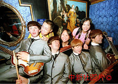 即將開放的“香港杜莎夫人蠟像館”28日向新聞界預(yù)展,披頭士樂隊(duì)的樂迷與逼真的蠟像合影留念。中新社傳真洪少葵攝