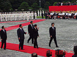 日本首相森喜朗今日在東京迎賓館舉行隆重的歡迎儀式,歡迎中國總理朱镕基總理訪日。圖為朱镕基在森喜朗首相陪同下檢閱儀仗隊,向歡迎人群揮手致意。中新社記者:王曉暉