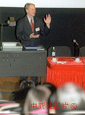 ‘曾三次執(zhí)行太空穿梭機特別飛行任務的美國太空人尼爾遜博士,十月二十一日在香港科學館舉行的“二十一世紀科學及科技教育透視”研討會上作演講。中新社傳真 任海霞攝