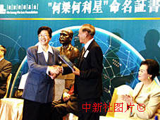 圖文:表彰港人貢獻(xiàn) 小行星被命名為“何梁何利星” 2000年11月8日 07:44 ![]() 朱麗蘭出席行星命名頒授儀式。中國科學(xué)院南京紫金山天文臺特別將一顆小行星命名為“何梁何利星”。國家科技部部長朱麗蘭(左)七日在香港出席該行星命名的頒授儀式。中新社傳真 王順 攝