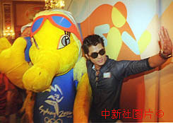 7日是悉尼2000年奧運會開幕倒數(shù)一百天,奧運之星郭富城在香港出席奧運MTV首播儀式,并與吉祥公仔合照。中新社傳真鄧慶樂攝