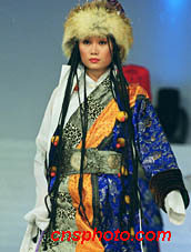 北京嘉里中心飯店二十二日晚在京舉辦中國(guó)模特赴德國(guó)展示的歷代和民族服飾作品。圖為色彩艷麗的中國(guó)藏族服飾。中新社圖 東方 攝