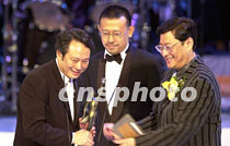中國大陸影帝姜文29日在香港舉行的“第二十屆香港電影金像獎頒獎典禮”上,與香港名導演吳思遠將最佳導演獎,頒發(fā)給李安。中新社傳真 洪少葵 攝