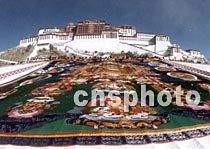 由西藏著名藝術家用一年多時間制成的巨型唐卡《至貴殊靈彩緞展佛》將在北京展覽的西藏文化展上展出。該唐卡高45米、寬35米,為世界之最,已被列入吉尼斯世界記錄。中新社圖 吳新華 攝