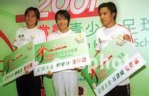 影星周星馳、本地甲組足球員丘健威(右)、陳豪文(左)8日在香港出席“2001麥當(dāng)勞青少年足球推廣”記者會(huì),獲邀出任足球大使,協(xié)助青少年足球推廣活動(dòng)。中新社傳真 鄧慶樂(lè) 攝