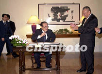 國家主席江澤民五月九日出席香港特區(qū)行政長官董建華舉辦的午宴上在留言簿上簽名。中新社傳真 任海霞 攝