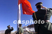 多彩西藏:布達拉宮前看升旗(圖文) 2001年5月24日 06:48 ![]() 中國西藏拉薩布達拉宮廣場二十三日舉行隆重的升旗儀式,慶祝西藏和平解放五十周年。中新社記者 滿會喬 攝 ![]() 全國人大常委會副委員長、西藏自治區(qū)政協(xié)主席帕巴拉·格列朗杰(中),自治區(qū)黨委常務(wù)副書記、自治區(qū)人大主任熱地(右)等出席了在拉薩布達拉宮廣場舉行的“升國旗·唱國歌”儀式。中新社記者 滿會喬 攝