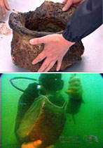 中國云南撫仙湖水下考古的隊員們六月三日九時許,在水下考古現(xiàn)場發(fā)現(xiàn)一個陶器,并將這個陶器運出水面進行研究分析,有專家認為這是漢代的“釜”(鍋),是一種生活用具。