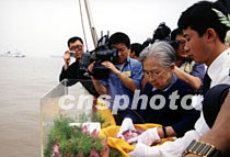 杰出的愛(ài)國(guó)宗教領(lǐng)袖、原全國(guó)政協(xié)副主席、民進(jìn)中央名譽(yù)主席趙樸初因病于2000年5月21日在北京逝世。根據(jù)趙樸初的遺愿,他的骨灰于6月2日撒在上海吳淞口的大海。圖為趙樸初的夫人陳邦織捧起骨灰撒向大海。中新社圖 郭海鵬 攝