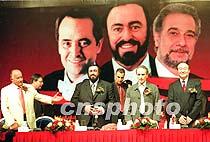 圖:三大男高音演唱會新聞發(fā)布會 2001年06月21日 18:46 ![]() 世界三大男高音北京紫禁城演唱會新聞發(fā)布會21日在北京舉行,先期到達北京的帕瓦羅蒂、卡雷拉斯和三大男高音的經(jīng)濟人魯?shù)浪沟瘸鱿⒒卮鹆酥型庥浾叩奶釂。中新社記?李剛 攝