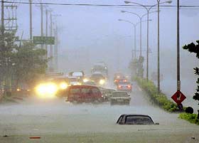 桃芝臺風(fēng)造成臺灣46人死亡 當(dāng)局解除陸上警報 2001年07月31日 10:08 ![]() 當(dāng)局出動直升機(jī)救援被困民眾 ![]() 暴雨造成公路淹水,許多汽車在水中動彈不得。 中新網(wǎng)香港7月31日消息:桃芝臺風(fēng)重創(chuàng)臺灣,截至臺灣有關(guān)當(dāng)局今天上午8時30分統(tǒng)計,已經(jīng)造成46人死亡、150人失蹤、32人受傷。目前已知至少花蓮還有37人失蹤、南投縣有87人失蹤、臺中縣有13人失蹤。由于失蹤多屬落水或被土石流淹沒,預(yù)估罹難人數(shù)可能還會大幅暴增。 另一方面,隨著桃芝臺風(fēng)移向大陸,臺灣氣象局今天上午5時25分解除陸地臺風(fēng)警報,海上警報不排除在中午以前解除。不過,今天臺灣西半部及東北部仍有機(jī)會出現(xiàn)豪雨,氣象局提醒民眾仍要多注意。 桃芝臺風(fēng)雖然已經(jīng)逐漸遠(yuǎn)離,但是強(qiáng)勁雨勢,造成各地紛紛傳出災(zāi)情,使得后續(xù)善后的工作無法完成,受創(chuàng)嚴(yán)重的南投縣政府及臺中縣和平鄉(xiāng),已經(jīng)做出31日停止上班上課的決定。 至于宣布照常上班上課的縣市則有:臺北縣、臺北市、臺中市、連江縣;彰化縣是正常上班、但是國中小停課,高中以上正常上課。 電信方面,至30日22時止,共有16790戶電話故障。用水部分,花蓮、臺東、嘉義、南投、苗栗、臺中縣市、高雄縣等地區(qū),因豪雨致凈水場取水口遭土石淹沒,目前仍有478310戶停水。電力方面,全臺共有347581戶停電。 農(nóng)牧損失12.45億元,當(dāng)局將要求農(nóng)產(chǎn)公司等單位緊急釋出7千公噸蔬菜,避免菜價狂飆。 東森新聞援引臺灣的消防署統(tǒng)計資料,近15年來造成嚴(yán)重災(zāi)情的臺風(fēng)分別是2000年象神臺風(fēng)(64人死亡、25人失蹤、65人受傷);1996年賀伯臺風(fēng)(51人死亡、22人死亡、463人受傷);1997年溫妮臺風(fēng)(44人死亡、1人失蹤、84人受傷);1998年瑞伯臺風(fēng)(28人死亡、10人失蹤、27人受傷)。 |