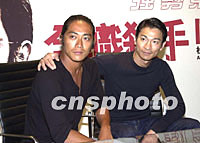 電影《全職殺手》兩位男主角劉德華反町隆史2日在香港與傳媒會面,劉德華搭著反町的膊頭,感謝他專程由日本抵港為影片宣傳造勢。中新社圖 鄧慶樂 攝