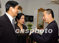 ![]() 澳門政府4日邀請(qǐng)香港巨星周潤發(fā)出席"第十五屆澳門國際音樂節(jié)"中的臥虎藏龍音樂會(huì),澳門文化局局長何麗鉆向發(fā)仔贈(zèng)送紀(jì)念品。中新社圖 任晨鳴 攝 ![]() 專程到澳門出席 "第十五屆澳門國際音樂節(jié)"臥虎藏龍音樂會(huì)的香港巨星周潤發(fā)和夫人,4日與奧斯卡金像獎(jiǎng)得主、著名指揮家譚盾在澳門喜相逢。中新社圖 任晨鳴 攝