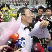 圖文:一討債公司老板向呂秀蓮求婚遭警方攔下 2001年12月11日 13:51 ![]() 呂秀蓮(資料圖片) ![]() 董念臺11日捧著99朵紅玫瑰,率領(lǐng)48輛豪華禮車,浩浩蕩蕩去向心儀許久的呂秀蓮求婚,但遭警方攔下。董念臺說不能阻止他求婚的意志。(張良一攝) 中新網(wǎng)香港12月11日消息:臺北訊,臺灣一討債公司負(fù)責(zé)人董念臺今天上午演出向呂秀蓮“求婚記”,不過求婚車隊(duì)在途中即遭到臺北市警察局?jǐn)r下,董念臺在不滿下憤而離去。 據(jù)“中央社”報(bào)道,對于今天的求婚之舉,董念臺稱,他欣賞呂秀蓮憨直、有話直說的個(gè)性,他認(rèn)為呂是位優(yōu)秀的女性。 上午九時(shí)許,由十二輛奔馳、十二輛卡迪拉克高級轎車組成的車隊(duì)從臺北市中正紀(jì)念堂出發(fā),浩浩蕩蕩準(zhǔn)備到“總統(tǒng)府”“求婚”。 車隊(duì)在抵達(dá)“總統(tǒng)府”前的貴陽路遭轄區(qū)員警攔下,董念臺穿著燕尾服,手上拿著九十九朵玫瑰和一封求婚信件,他不滿指出,他與呂秀蓮男女未婚,答應(yīng)求婚與否固然是女方的權(quán)利,但求婚也是他的自由,這是人民應(yīng)有的民主法治。 董念臺說,如果說他妨礙交通,事前他已去函臺北市警局,但警方并未制止,現(xiàn)在又說他違反“集會游行法”,他認(rèn)為是警方違法在先。 稍后,董念臺認(rèn)為既然高攀不起,憤而將玫瑰花扔在地上后離去。 相關(guān)報(bào)道:真情?搞笑?臺灣一討債公司老板向呂秀蓮求婚 |