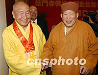 圖文:法門寺佛指舍利赴臺供奉發(fā)布會在西安舉行 2002年02月21日 22:08 ![]() 法門寺佛指舍利赴臺供奉新聞發(fā)布會,日前在西安喜來登大酒店舉行,中國佛教協(xié)會等有關(guān)人士和臺灣佛教人士以及來自大陸、港臺的眾多記者參加了發(fā)布會。圖為臺灣惟覺法師與法門寺凈一方丈在發(fā)布會上。中新社記者 錢興強 攝 ![]() 法門寺佛指舍利赴臺供奉新聞發(fā)布會,日前在西安喜來登大酒店舉行,中國佛教協(xié)會等有關(guān)人士和臺灣佛教人士以及來自大陸、港臺的眾多記者參加了發(fā)布會。圖為臺灣星云法師為賓客簽書。中新社記者 錢興強 攝