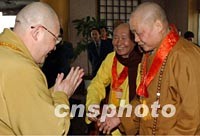 圖:兩岸佛教人士匯聚西安 2002年02月22日 09:30 ![]() 由臺灣佛教人士組成的法門寺佛指舍利赴臺灣地區(qū)瞻禮(供奉)恭迎團,日前乘專機抵達西安。圖為兩岸佛教人士相互施禮。中新社記者 錢興強 攝
