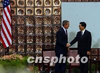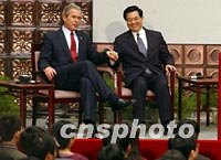 ![]() 中國(guó)國(guó)家副主席胡錦濤二十二日在北京清華大學(xué)聆聽(tīng)訪華的美國(guó)總統(tǒng)布什演講。中新社記者 賈國(guó)榮 攝