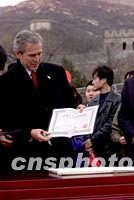 圖:布什獲得八達(dá)嶺長(zhǎng)城登城證書 2002年02月22日 19:27 ![]() 美國總統(tǒng)布什二十二日登上北京八達(dá)嶺長(zhǎng)城后,獲得登城證書。中新社記者 毛建軍 攝