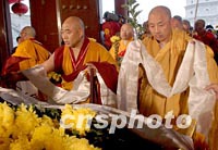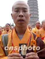 組圖:佛指舍利赴臺恭送法會在法門寺隆重舉行 2002年02月22日 20:12 ![]() 法門寺佛指舍利赴臺灣地區(qū)瞻禮(供奉)法會二十二日在西安法門寺舉行,來自臺灣的恭迎團(tuán),由大陸佛教人士組成的護(hù)送團(tuán)以及護(hù)法團(tuán)等各界有關(guān)人士千余人匯集法門寺。圖為佛家弟子向佛指舍利獻(xiàn)哈達(dá)。中新社記者 錢興強 攝 ![]() 法門寺佛指舍利赴臺灣地區(qū)瞻禮(供奉)法會二十二日在西安法門寺舉行,來自臺灣的恭迎團(tuán),由大陸佛教人士組成的護(hù)送團(tuán)以及護(hù)法團(tuán)等各界有關(guān)人士千余人匯集法門寺。圖為一法師手捧佛指舍利圖片念經(jīng)。中新社記者 錢興強 攝
