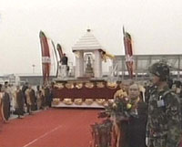 組圖:法門寺佛指舍利在咸陽機場登上專機赴臺 2002年02月23日 09:24 ![]() 機場恭送法會上,佛指舍利徐徐移向?qū)C。 ![]() 臺灣信眾在咸陽機場虔誠地恭送佛指舍利登機。 ![]() 機械平臺升高后,佛指舍利靠向機艙門。 ![]() 佛指舍利進入機艙。 ![]() 咸陽機場的佛指舍利恭送法會。 中新網(wǎng)西安2月23日消息:(記者張素平)今天上午9點整,運載佛骨舍利的“港龍航空”公司KA8943航班從陜西西安咸陽機場起飛。 此前,從早晨8:10時開始,在機場舉行了約15分鐘的恭送儀式。 運載佛指舍利和大陸佛教界護法團、護送團及臺灣佛教界恭迎團的兩架專機,將在約中午時分在香港作短暫停留,轉(zhuǎn)機后飛往臺北。 據(jù)悉,作為佛教圣物和無價國寶的佛指舍利,將在臺灣巡回瞻禮37天,之后由島內(nèi)佛界恭送之后返回法門寺。此次佛指舍利赴臺是根據(jù)臺灣地區(qū)佛教界的請求,由中央政府特別批準(zhǔn)的。這是海峽兩岸的佛門盛事。 此次大陸佛教界組成了60人護送團和20人護法團恭送佛指舍利赴臺瞻禮。臺灣佛教界表示將本著“聯(lián)合迎請,共同供奉”的原則,在臺北、臺中、高雄等地公共場所和佛教寺院供奉。