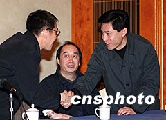 ![]() 二十集電視連續(xù)劇《公安局長》四月中旬即將開拍,該劇由田迪執(zhí)導(dǎo)。圖為著名作家海巖(左)向男主角陳寶國(右)祝賀。該劇由公安部、中國新聞社、四川有線電視臺以及誠成影聯(lián)影視策劃聯(lián)合攝制,將于今年秋季播出。中新社記者 張宇 攝