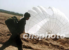 圖:空降新兵跳傘訓(xùn)練 2002年05月26日 18:28 ![]() 中國某空降部隊(duì)新兵,在五月的驕陽下進(jìn)行跳傘訓(xùn)練,一位新兵收傘后急速通過同伴的降點(diǎn)準(zhǔn)備下一次跳傘。因?yàn)樘c(diǎn)準(zhǔn)確、收傘快速是他們當(dāng)前訓(xùn)練的主要目標(biāo)。王麗南 攝